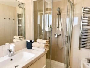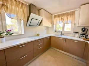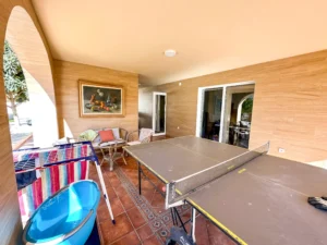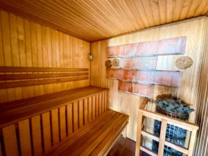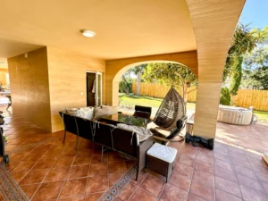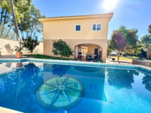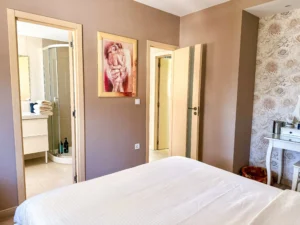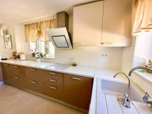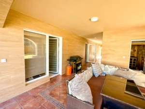 En la planta inferior dispone de dos dormitorios adicionales, una segunda cocina práctica para dar independencia y una terraza con vistas a la piscina y a la sauna.