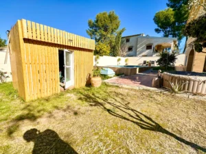 El exterior ofrece un jardín consolidado con riego por aspersión, piscina con depurador y un cuarto de herramientas.